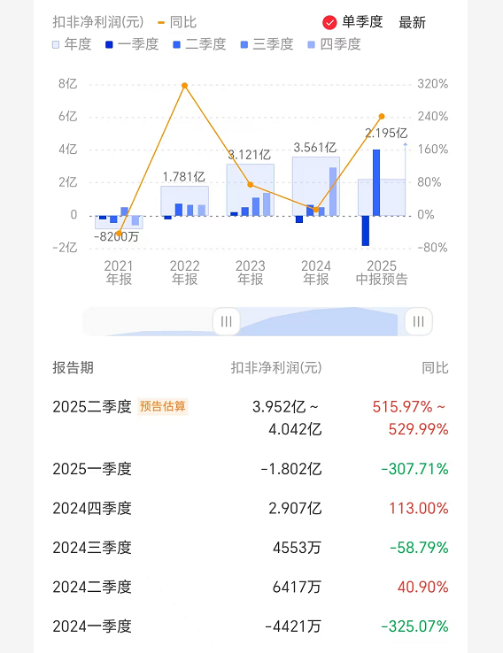 第二季度扣非净利润3.95亿到4.04亿,同比增长超500%。