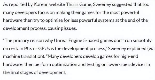 近日在韩国举行的“虚幻节”上,Epic的CEO接受记者采访时,回答了为什么虚幻5引擎经常会出现性能问题。他说通常情况下,开发者们会用高性能硬件开发游戏,直到游戏研发末尾才尝试中低端硬件。这种方法是导致游戏出现性能问题的关键所在!