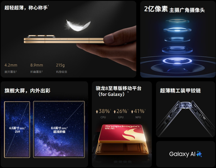 心系天下三星W26在外观设计上追求极致,整机重量仅215克,较前代产品减轻约40克,折叠状态下机身厚度仅8.9毫米,展开后更是薄至4.2毫米,成为三星W系列中最轻薄的折叠屏手机。如此纤薄的机身,得益于升级版增强型装甲铝边框和超薄精工装甲铰链的采用,不仅提升了机身的强度与抗变形能力,还有效抵御了日常碰撞与跌落等意外损伤,为设备提供了坚实可靠的防护屏障。