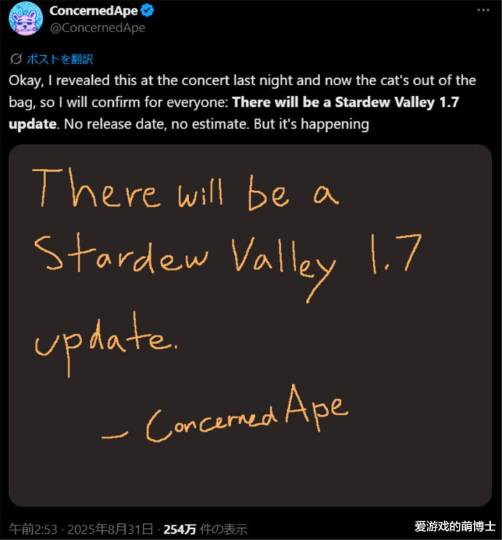 这个消息最初在西雅图举行的 “星露谷季节交响曲” 巡演现场被揭晓。当Eric Barone在舞台上说出 “我想分享一个秘密,游戏还会有新改版”时,全场瞬间响起欢呼声。随后他在官方账号上证实了这个消息:“1.7版本一定会来,没有发布日期,没有时间预估,但它一定会发生”。这种“画饼”的说法放在其他人身上可能会被玩家质疑,而Eric Barone说出来,玩家们知道他肯定说到会做到。