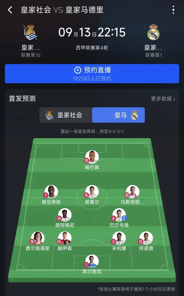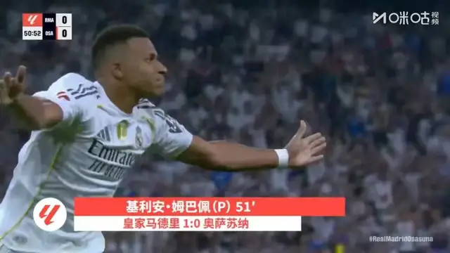 西甲第1轮,皇家马德里坐镇主场伯纳乌迎战奥萨苏纳。上半场,怀森、米利唐远射被扑,姆巴佩造险。下半场,姆巴佩造点并主罚命中,卡瓦哈尔复出,马斯坦托诺首秀,布雷通斯染红。最终皇马1-0奥萨苏纳收获开门红。