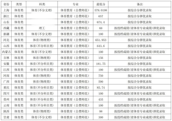 华东师范大学2025年体育类国家公费师范生在各省各专业录取分数线