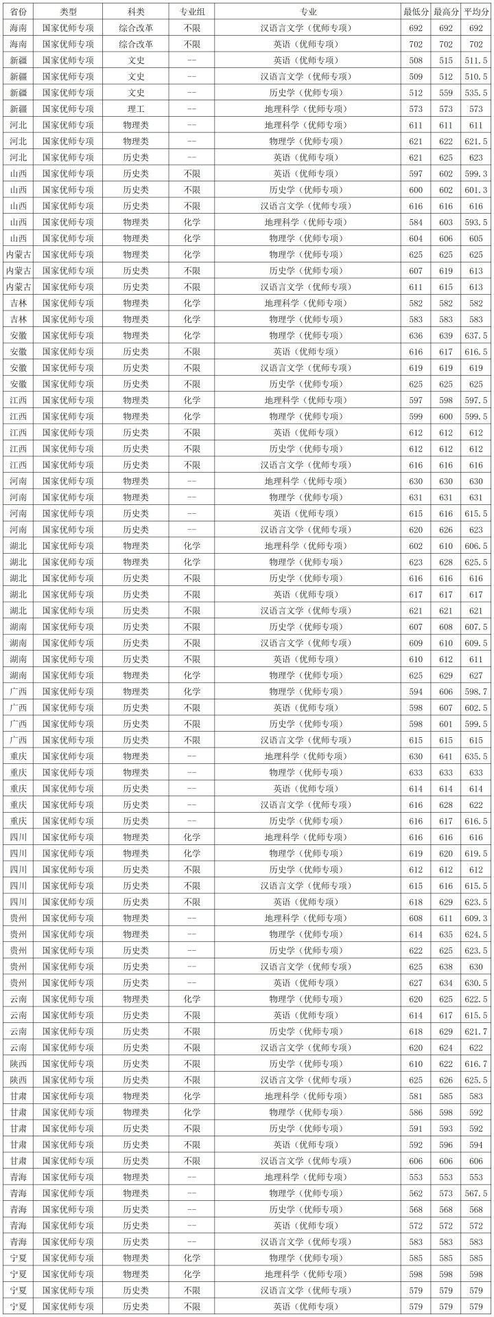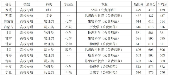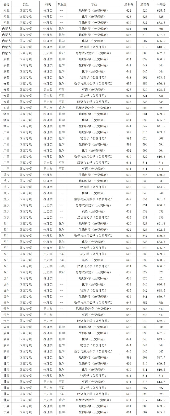 华东师范大学2025年高校专项批中国家公费师范生在各省各专业录取分数线